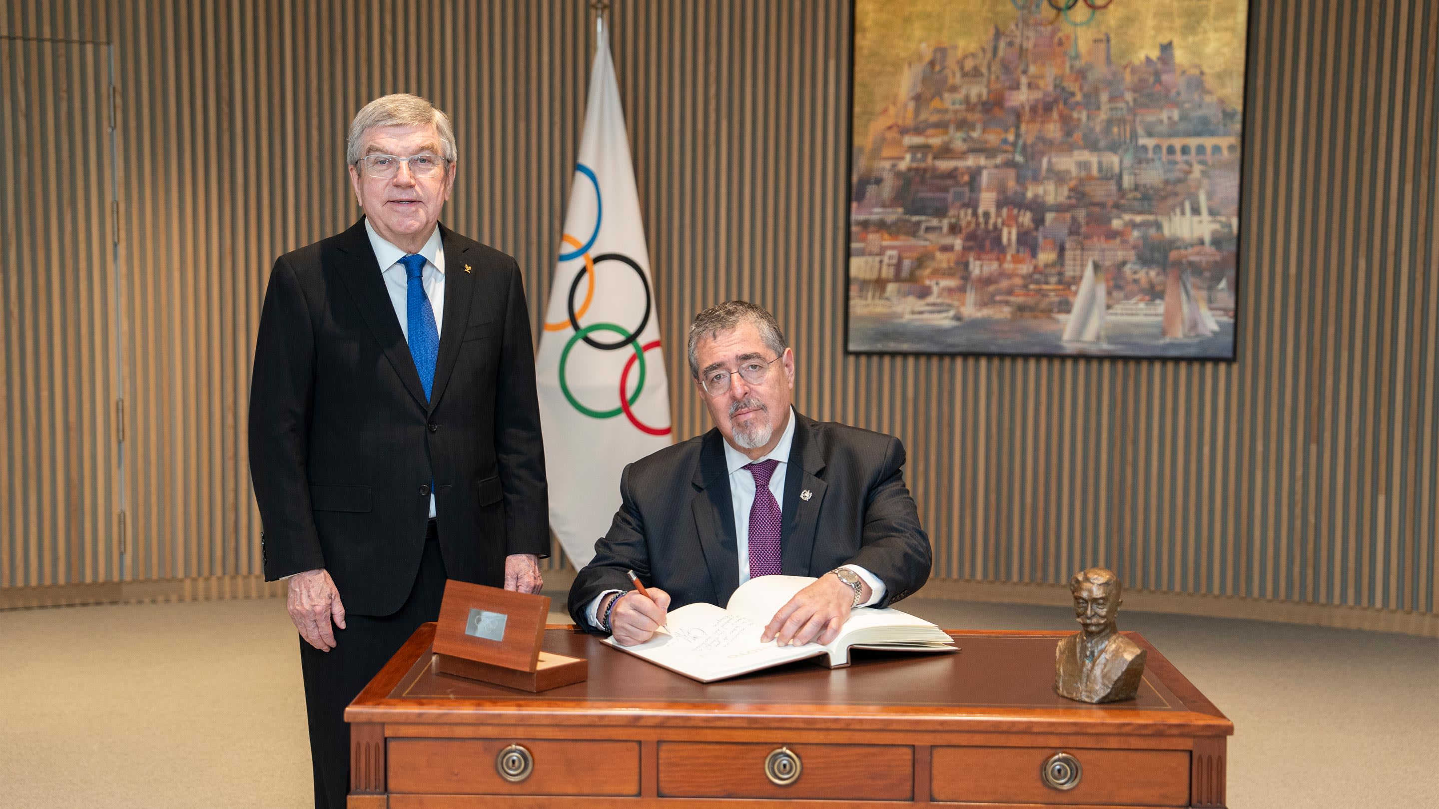 21 février 2024 - Au cours de sa visite à la Maison Olympique, le président guatémaltèque a signé le "Livre d'or" et le président de l'instance olympique lui a remis la médaille Coubertin réservé aux chefs d'État et de gouvernement, conçue par le fondateur du Mouvement olympique moderne, Pierre de Coubertin. Le président du CIO a remercié le président Arévalo pour l'excellent leadership dont il a fait preuve et lui a rendu hommage pour son engagement envers les athlètes guatémaltèques, le sport et les valeurs du sport dans la société.