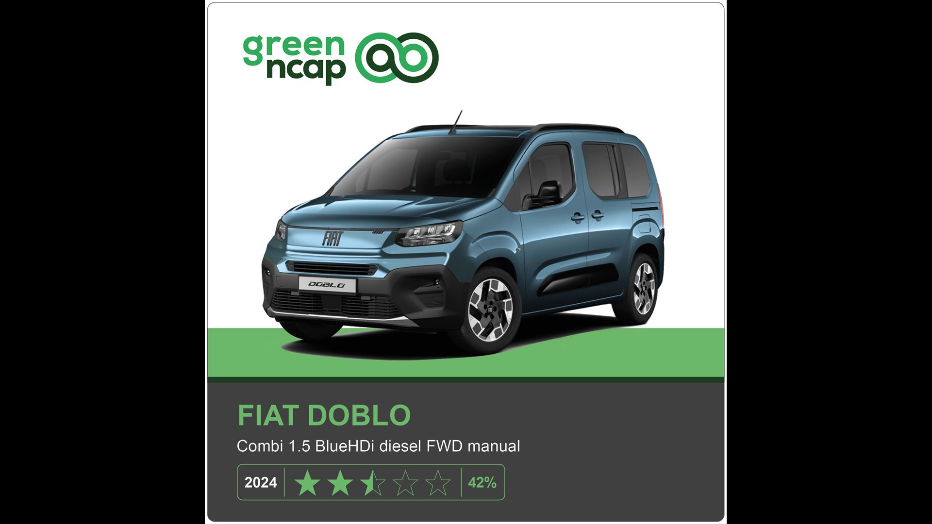 The FIAT Doblo, a car designed on a van, was first launched by FIAT in October 2000. It has remained a consistent choice for consumers for its positive van attributes, such as its high seating position, spacious interior and ample passenger capacity. We tested the FIAT Doblo Combi 1.5 Blue HDi diesel FWD manual. Like other fossil-fuelled cars, it struggles most with greenhouse gas emissions, namely CO2, which is compounded by the relatively high consumption figures of this small van. More positively, exhaust pollutant emissions are managed impressively and, like the CR-V, are kept far below legal limits and Green NCAP thresholds. Further improvement of cold start emissions control could help the FIAT achieve an even higher score than the current 8.6 out of 10. The FIAT Doblo delivers an overall score of 42% and 2.5 Green Stars.
