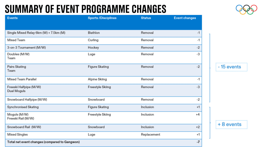 - The programme will include the seven core Winter Olympic sports (biathlon, bobsleigh, curling, ice hockey, luge, skating and skiing) and eight new events, including synchronised skating, mixed singles luge, moguls, and rail events for freestyle skiing and snowboarding, while 15 events from Gangwon will no longer be on the programme.