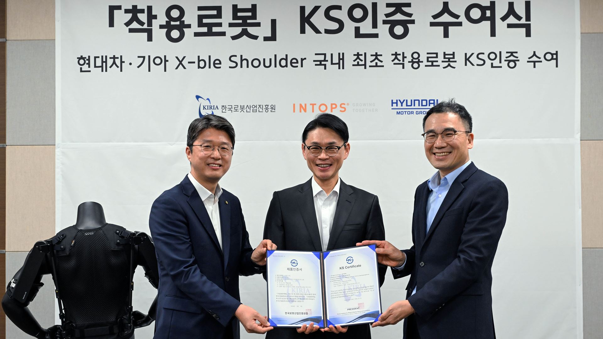 Hyundai Motor Group (the Group) announced today that its X-ble Shoulder industrial wearable robot has obtained the Korea Industrial Standards (KS) certification from the Korea Institute for Robot Industry Advancement (KIRIA).