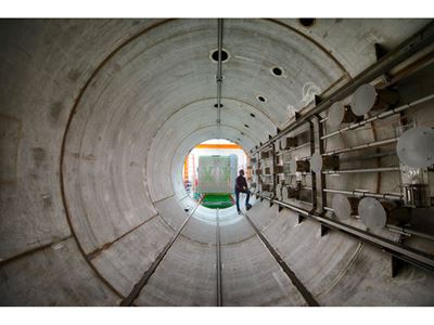 CUTLINE: Workers install a component of MicroBooNE’s precision detector (called a time projection chamber) into the cylindrical container, or cryostat. (Fermilab photo by Reidar Hahn)