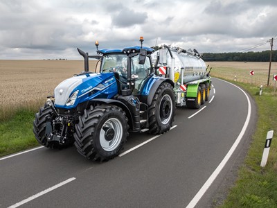 Maximum gross vehicle weight is up to 19,000kg, where local legislation permits, enabling these tractors to handle large mounted and trailed implements on the road and make use of a new wheel weight design for convenient ballasting. Also available for the first time on a New Holland tractor is an integral central tyre inflation system. This allows increased flexion (IF) or very high flexion (VF) tyres to be operated at their lower recommended pressures when at work in the field, to lengthen tyre footprints, increasing ground contact, minimising wheelslip and pressure, and maximising fuel efficiency. With fieldwork complete, fast reinflation from the cab is then possible for road travel at maximum permitted speed, via a gear-driven high-capacity twin cylinder air compressor.