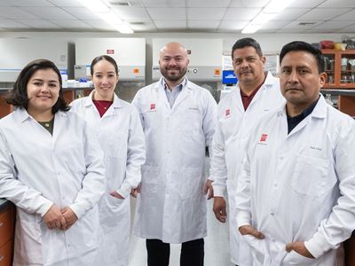 PHOTO CAPTION: New Mexico State University’s Food Safety Laboratory has achieved accreditation from the American Association for Laboratory Accreditation for microbiological testing services. The lab’s team includes, starting from left, Karla Villalobos Porras, Yatziri Presmont, Luis Sabillón Galeas, Ruben Zapata and Juan Olea. (NMSU photo by Josh Bachman)