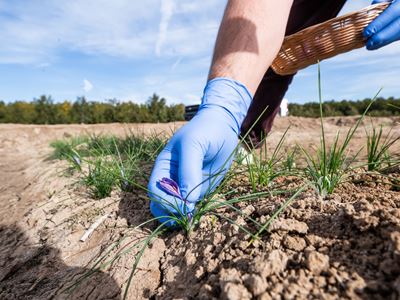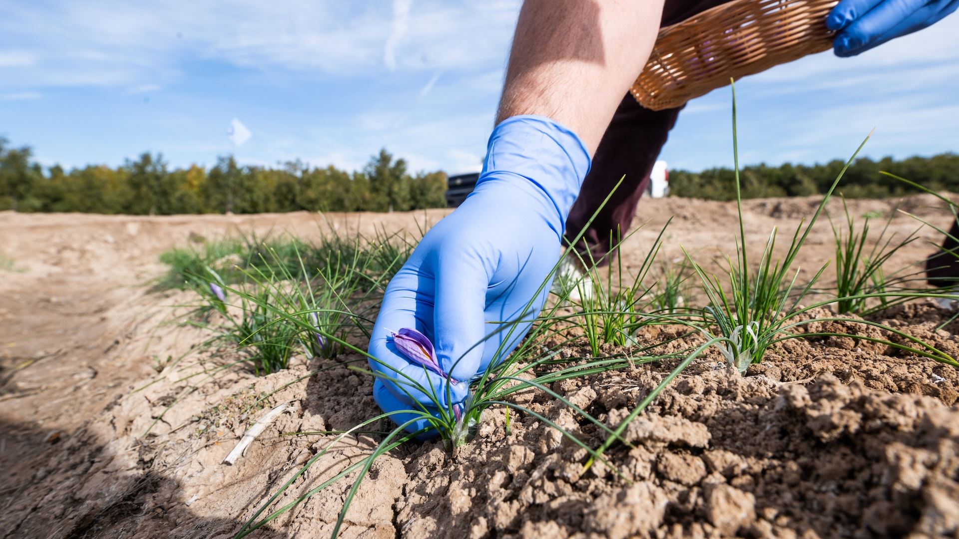 IMAGE DESCRIPTION: A hand picking small purple saffron flowers from a field.