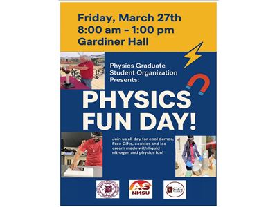 Organized by the NMSU Physics Graduate Student Organization (PGSO), “Physics Fun Day” is open from 8 a.m. to 1 p.m. Friday, March 27 at Gardiner Hall at NMSU. It is free and open to the public, giving participants a way to actively explore the world of physics.
